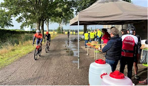 Het was ‘s morgens vroeg druk in de manegehal van de Balloohoeve in Balloo. Zo’n 1100 gestarte deelnemers aan Drenthe200 moesten in korte tijd goed worden verzorgd door een groep vrijwilligers van ‘t Kamrad. Dat was goed georganiseerd en daardoor kon iedereen snel weer de route op richting de volgende post nabij Gieten.